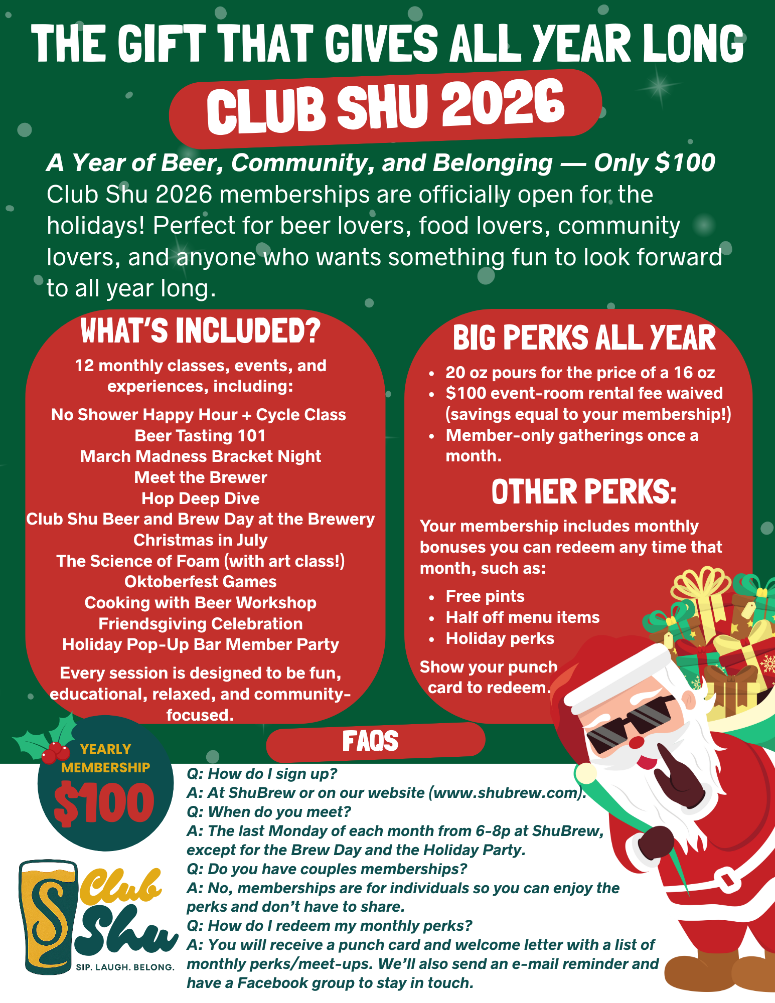 🍺 $10 per class (includes a ShuBrew beer or hard seltzer – GF!)